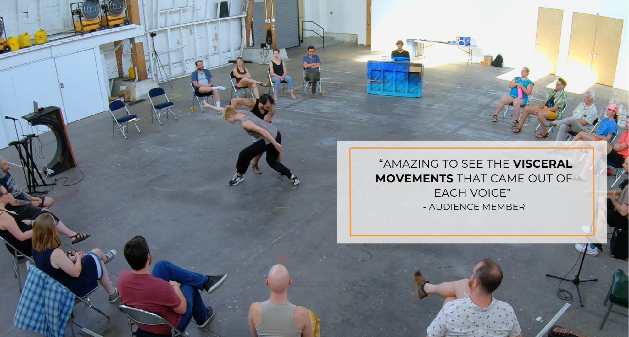 Participants enter the event space through a sensory environment designed to ignite curiosity. They are invited to record sounds, words, and stories that will become the musical score. Audiences are invited to participate as much or as little as they choose. Using digital music mixing tools, Tyler Leif Catanella transforms the recorded samples in real time into music— coughs become drum beats, yawns become melodies, heartfelt messages bloom into lyrics. The performance itself begins with a heartbeat and a breath. A cast of performers use create character and movement in response to these sounds and turn the recordings into images and stories. The event ends in a dance party, followed by a meal and conversation.